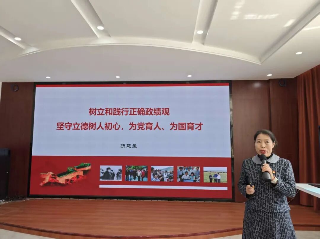 本次活动内容丰富、形式多样,活动分为四大环节有序开展。在教职工理论集体学习环节,学校党委委员、马克思主义学院院长张延星教授以《树立和践行正确政绩观,坚守立德树人初心,为党育人、为国育才》为题作领学辅导,围绕“政绩为谁而树、树什么样的政绩、靠什么树政绩”,结合高校教育工作实际,为全体教师带来一堂深刻的理论课,引导教师将正确政绩观融入教书育人全过程。