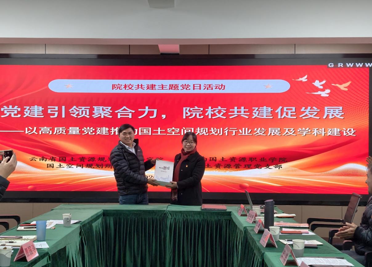活动尾声,云南省国土资源规划设计研究院国土空间规划所党支部向国土管理党支部赠送《国土空间规划管理手册》,为学院专业教学提质与党建工作增效提供了重要的资料支撑。