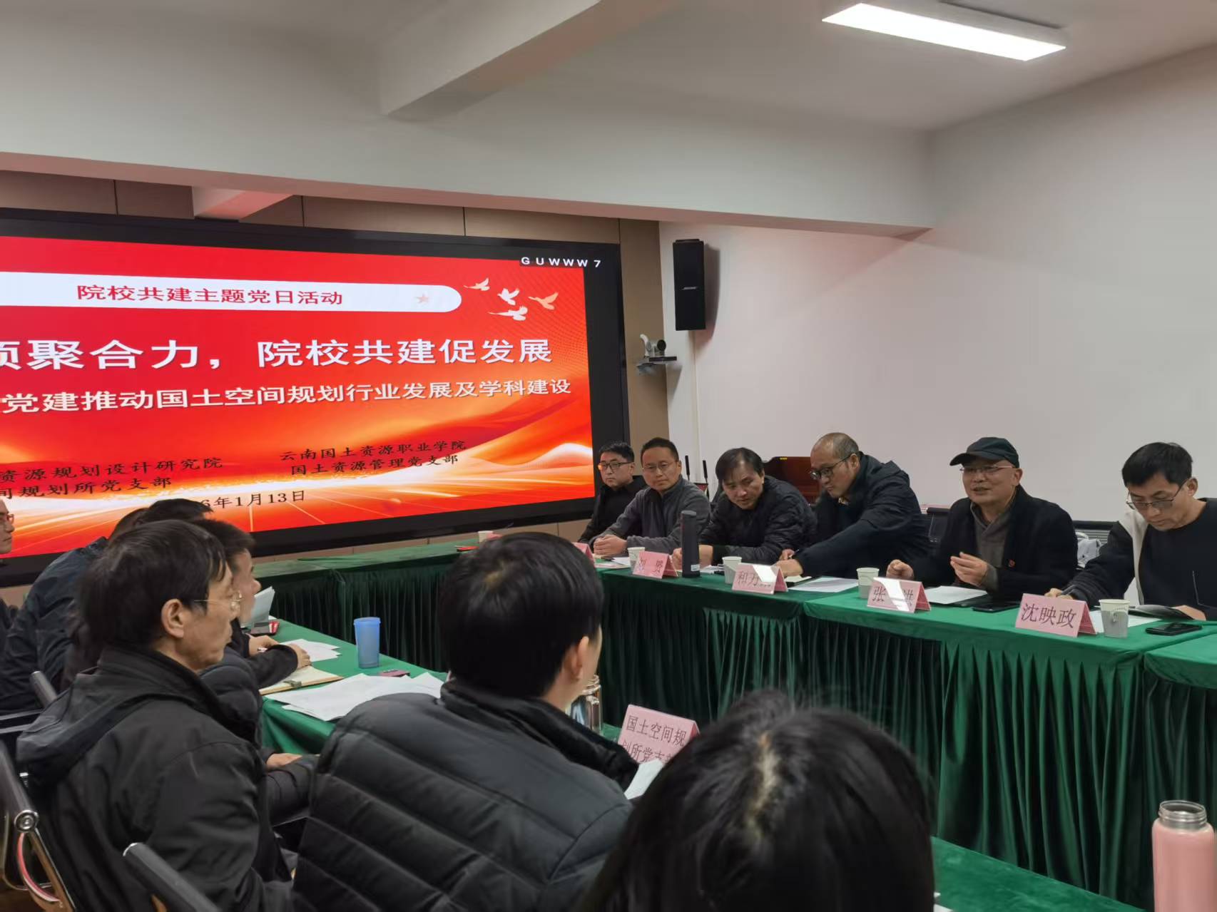 为深入贯彻落实新时代党的建设总要求,以高质量党建赋能国土空间规划与人才培养深度融合,1 月 13 日下午,国土空间信息学院国土管理党支部与云南省国土资源规划设计研究院国土空间规划所党支部,在云南省国土资源规划设计研究院二楼会议室联合开展支部共建活动。学院院长张洪、副院长沈映政、党委副书记和万荣,国土管理党支部书记张宏品及支部党员教师代表共同参与此次活动。